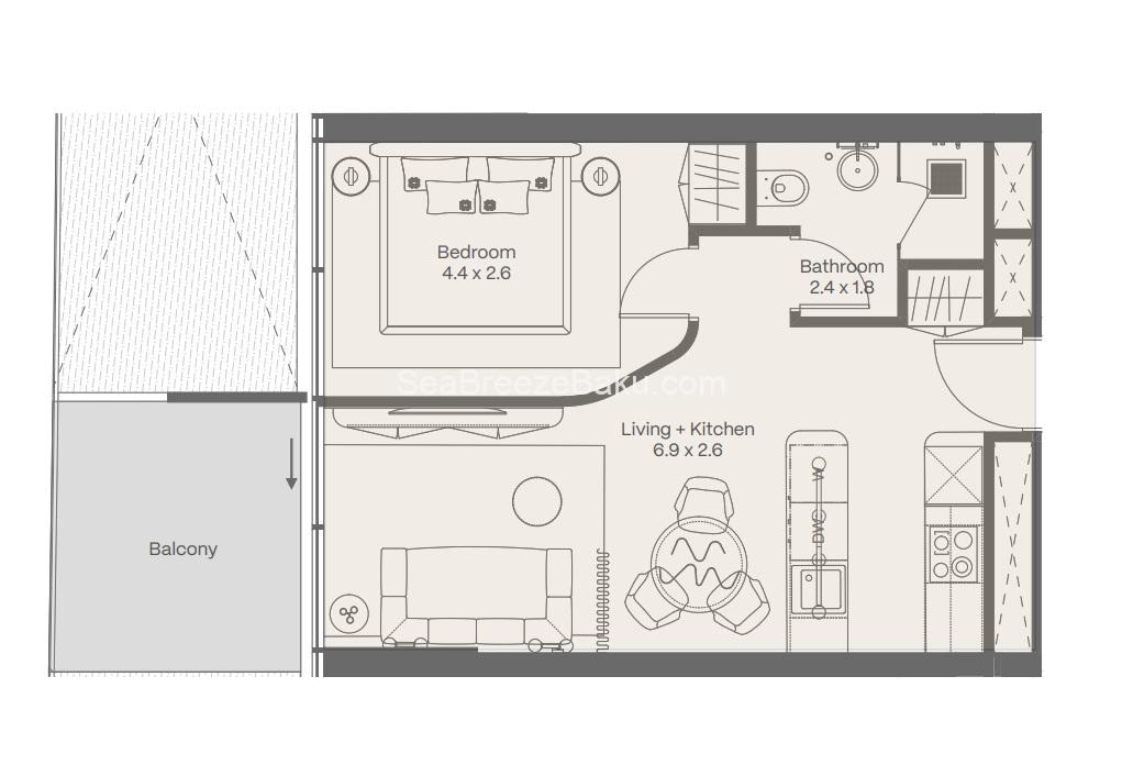 The layout includes a bright living room, a separate kitchen area, a cozy bedroom, a bathroom, and a spacious balcony connected directly to the living room.